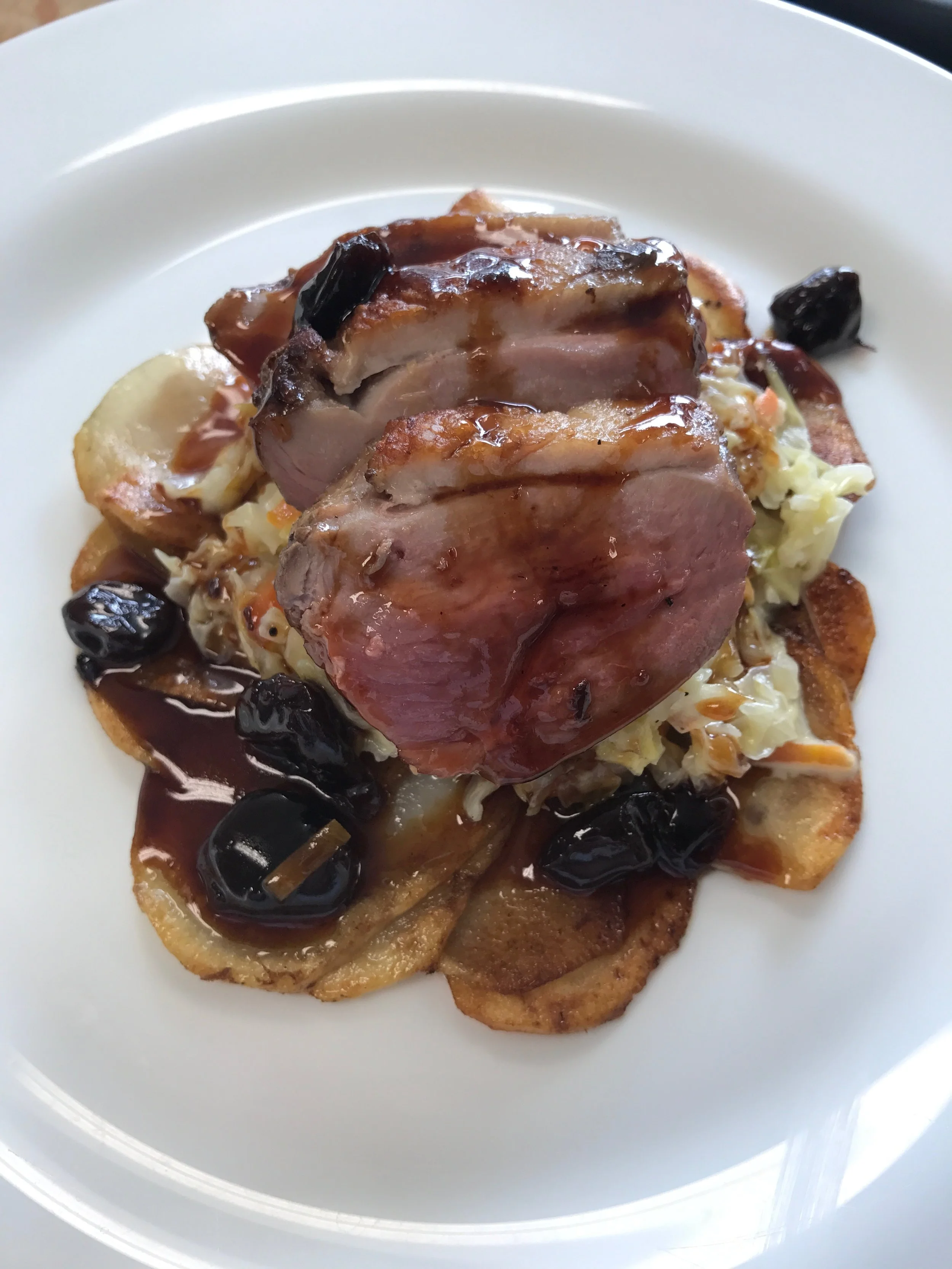 cold seared duck breast, braised cabbage, potato crisp, dark caramel cherry sauce (Copy)